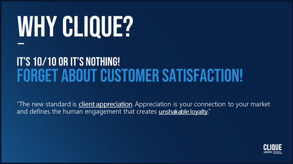 In the dynamic world of freight management, where reliability and customer service are paramount, Clique Logistics stands out as “Your Mates in Transport.” At the core of our commitment lies a relentless pursuit of fast and reliable customer service, aiming for a perfect 10 out of 10 in every interaction.